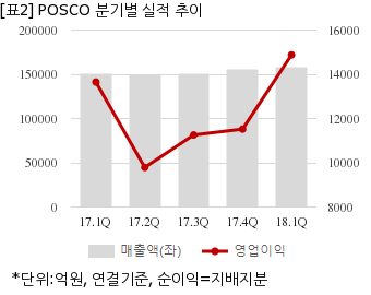 POSCO는 올해 1분기 연결기준 매출액이 15조8622억원으로 전년 동기 15조771억원 대비 5.2% 늘었다. 같은기간 영업이익은 1조4877억원으로 전년 동기 1조3649억원 대비 8.9% 늘었다. 지배지분 순이익은 9935억1601만원으로 전년 동기 8509억2826만원 대비 16.7% 늘었다.