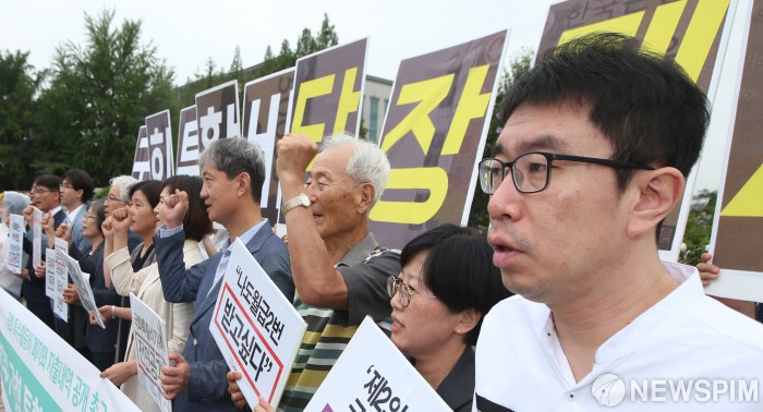 [서울=뉴스핌] 최상수 기자 = 참여연대 회원들이 9일 오전 서울 여의도 국회 정문 앞에서 국회 특수활동비 폐지와 지출내역 공개를 촉구하는 기자회견을 열고 구호를 외치고 있다. 2018.07.09 kilroy023@newspim.com