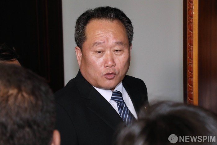[판문점=뉴스핌] 사진공동취재단 = 북측 수석대표인 리선권 조국평화통일위원회 위원장이 13일 오후 판문점 북측 통일각에서 열린 남북고위급회담 종결회담 후 취재진의 질문에 답변하고 있다. 2018.08.13