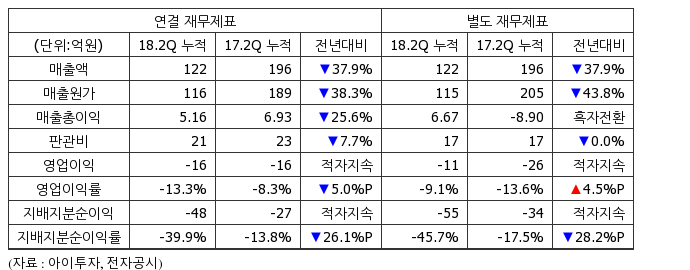 올해 2분기 누적 기준 연결 매출액은 122억313만원으로 전년 동기 196억6286만원 대비 37.9% 감소했다.