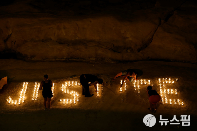 | [슬리에마 로이터=뉴스핌] 이홍규 기자 = 반(反)부패 단체 '오큐파이 저스티스(Occupy Justice)'의 운동가들이 몰타 슬리에마 해변에서 탐사보도 전문기자 다프네 카루아나 갈리지아 암살 10개월을 기념하기 위해 촛불을 통해 'JUSTICE(정의)'라는 단어를 표현하고 있다. 2018.08.16 |