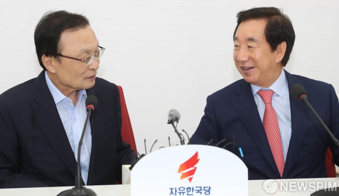 [서울=뉴스핌] 김학선 기자 = 이해찬 더불어민주당 신임 대표가 27일 서울 여의도 국회 본청 자유한국당 원내대표실을 예방해 김성태 원내대표와 대화를 나누고 있다. 2018.08.27 yooksa@newspim.com