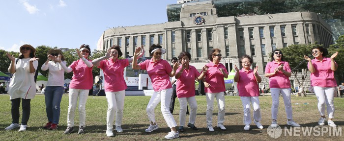 [서울=뉴스핌] 이형석 기자 = 5일 오후 서울 중구 서울광장에서 열린 2018 서울 마을주간 기념행사에서 참가자들이 강강서울래 퍼포먼스를 하고 있다. 서울 마을주간은 서울시와 자치구에서 진행된 다양한 마을과 자치 활동의 의미와 성과를 나누는 상호 격려와 응원의 행사다. 2018.09.05 leehs@newspim.com