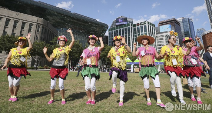 [서울=뉴스핌] 이형석 기자 = 5일 오후 서울 중구 서울광장에서 열린 2018 서울 마을주간 기념행사에서 참가자들이 강강서울래 퍼포먼스를 하고 있다. 서울 마을주간은 서울시와 자치구에서 진행된 다양한 마을과 자치 활동의 의미와 성과를 나누는 상호 격려와 응원의 행사다. 2018.09.05 leehs@newspim.com