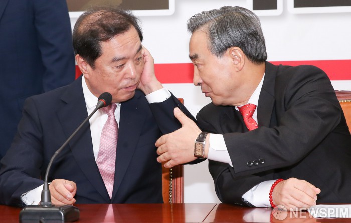 [서울=뉴스핌] 최상수 기자 = 김병준 자유한국당 비상대책위원장, 전옥현 국가안보특별위원회 위원장이 6일 오전 서울 여의도 국회에서 열린 국가안보특별위원회 임명장 수여식 및 1차 전체회의에서 대화를 나누고 있다. 2018.09.06 kilroy023@newspim.com