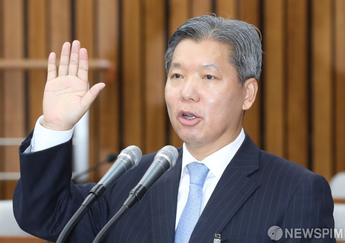 [서울=뉴스핌] 김학선 기자 = 이영진 헌법재판관 후보자가 11일 국회에서 열린 인사청문회에서 선서를 하고 있다. 2018.09.11 yooksa@newspim.com