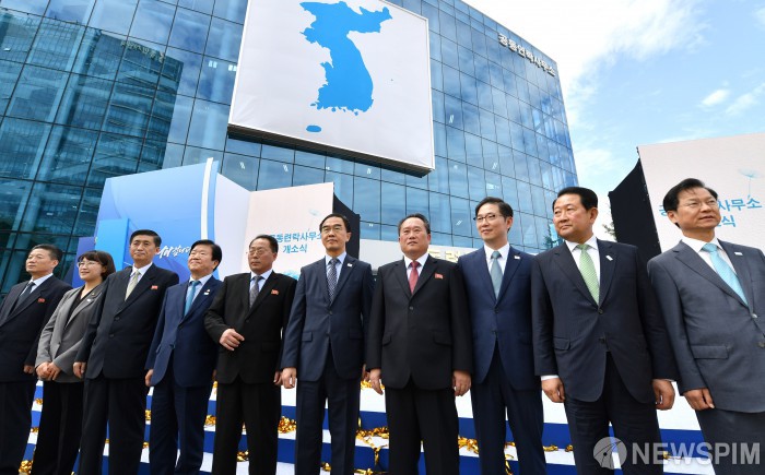 [개성=뉴스핌] 사진공동취재단 = 남측 조명균 통일부 장관, 북측 리선권 조국평화통일위원회 위원장 외 주요 참석자들이 14일 오전 북한 개성공단 내 남북공동연락사무소 청사 앞에서 열린 개소식에서 현판 제막식을 마친 뒤 기념촬영을 하고 있다. 2018.09.14