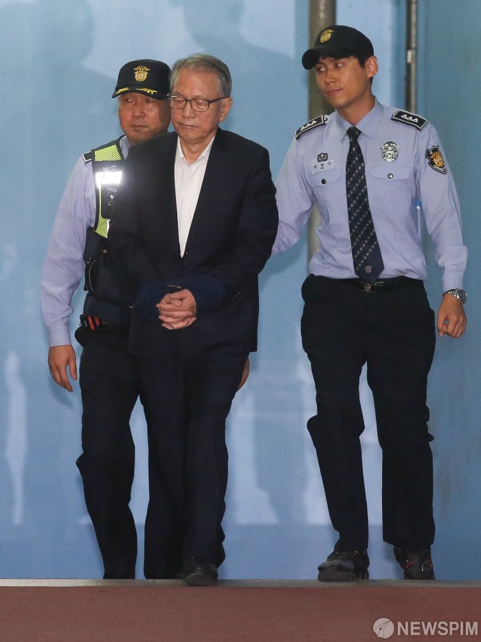 [서울=뉴스핌] 최상수 기자 = 김기춘 전 청와대 비서실장이 5일 서초구 서울중앙지방법원에서 열린 박근혜 정부 보수단체 불법지원(화이트리스트) 관련 선고 공판에서 징역 1년 6개월 실형을 선고받은 후 다시 구치소로 향하고 있다. 2018.10.05 kilroy023@newspim.com