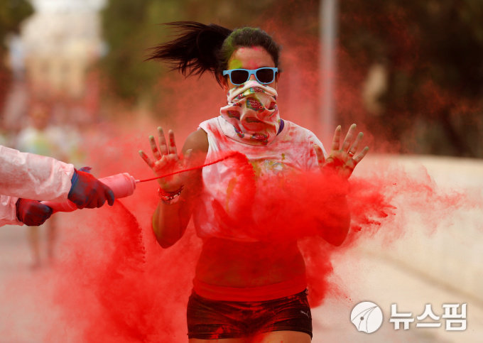 [몰타 로이터=뉴스핌] 최윤정 인턴기자 = 몰타 발레타 마삭셋 항에 있는 마노엘섬에서 '컬러 마이 런(Colour My Run)' 자선행사가 열린 가운데 28일(현지시각) 한 참가자가 색소 가루를 맞으며 달리고 있다.