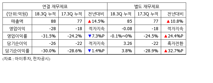 올해 3분기 누적 기준 연결 매출액은 88억9029만원으로 전년 동기 77억5824만원 대비 14.5% 늘었다.