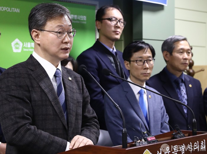 [서울=뉴스핌] 윤창빈 수습기자 = 16일 서울시의회 본관에서 열린 사립유치원 비리근절 기자회견에서 장인홍 서울시의회 교육위원장이 질문에 대답하고있다. 2018.11.16 pangbin@newspim.com