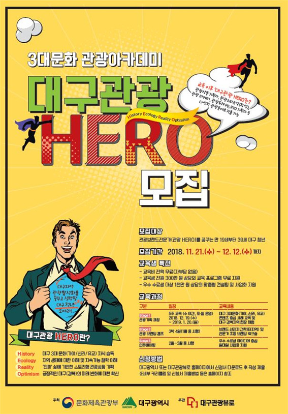 ‘3대문화 관광아카데미’는 현시대가 원하는 4차 산업형 관광장인(관광 HERO)을 육성하여 대구 3대문화를 활용한 특화 콘텐츠 발굴과 일자리 창출을 목표로 한다. 관광아카데미는 (사)대구관광뷰로(대표 오용수)가 총괄 주관하고 한국생산성본부가 교육운영을 맡아 진행된다.