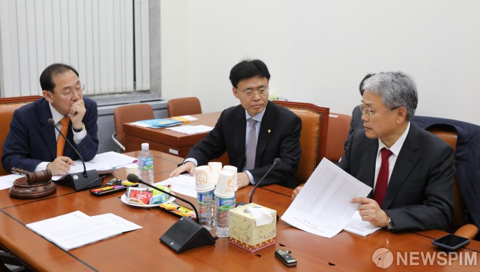 [서울=뉴스핌] 최상수 기자 = 3일 오후 서울 여의도 국회에서 열린 정치개혁특별위원회 정치개혁 제2소위원회에서 정유섭 위원장, 최교일 자유한국당 의원, 김동철 바른미래당 의원이 대화를 나누고 있다. 2018.12.03 kilroy023@newspim.com