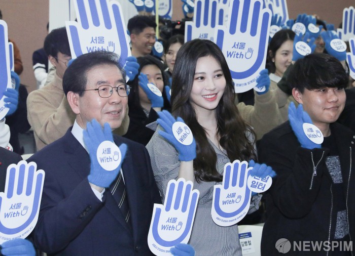 [서울=뉴스핌] 윤창빈 수습기자 = 박원순 서울시장(왼쪽부터), 걸스데이 유라가 3일 오후 서울 중구 서울시민청에서 열린 ‘서울 #With U’ 프로젝트 출범식에서 ‘서울 With you' 라는 문구가 쓰여진 장갑을 끼고 손을 흔들고 있다. 2018.12.03 pangbin@newspim.com