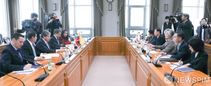 [서울=뉴스핌] 윤창빈 수습기자 = 강경화 외교부장관과 까를로스 홀메스 뜨루히요(Carlos Holmes Trujillo) 콜롬비아 외교부장관이 17일 오전 서울 종로구 외교부청사에서 양자회담을 하고 있다. 2018.12.17 pangbin@newspim.com