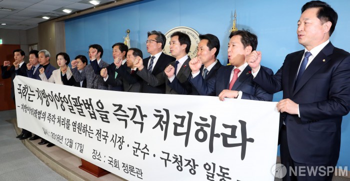 [서울=뉴스핌] 김학선 기자 = 더불어민주당 소속 전국 시장, 군수, 구청장들이 17일 국회 정론관에서 기자회견을 열고 국회의 지방이양일괄법 즉각 처리를 촉구하고 있다. 2018.12.17 yooksa@newspim.com