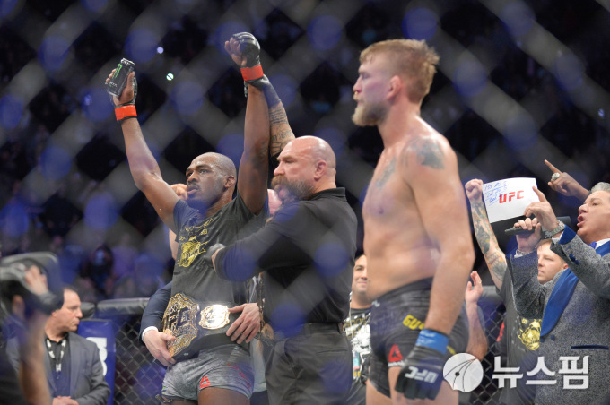 [LA 미국 로이터=뉴스핌] 김용석 기자 = ‘악동’ 존 존스(왼쪽)가 구스타프손을 꺾고 라이트 헤비급 챔프에 등극했다. ‘라이트헤비급 1위’ 존 존스(31·미국)는 30일(한국시간) 미국 캘리포니아주 잉글우드 더 포럼에서 열린 UFC 232 메인 이벤트에서 ‘2위' 알렉산더 구스타프손(31·스웨덴)을 상대로 3라운드 TKO승을 거뒀다. 존 존스는 3라운드에서 테이크다운에 이은 파운딩 공격으로 KO승을 장식했다. 그는 지난해 7월 코미어와의 경기전 금지 약물 복용 혐의로 라이트헤비급 챔피언 박탈된 바 있다. 이로써 존 존스는 1년1개월만에 챔피언에 복귀했다. 2018.12.30.