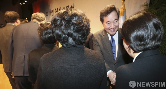 [서울=뉴스핌] 이형석 기자 = 이낙연 국무총리가 2일 오전 서울 종로구 정부서울청사 별관에서 열린 2019 정부시무식에서 정부 관계자들과 악수를 하고 있다. 2019.01.02 leehs@newspim.com