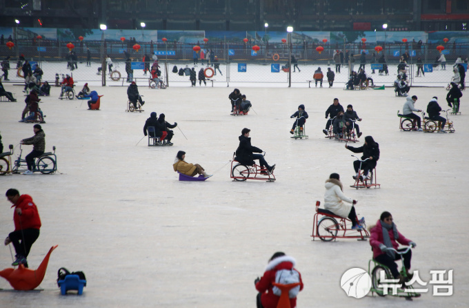 | [베이징 로이터=뉴스핌] 정윤영 인턴기자 = 2일(현지시간) 중국 베이징(北京)의 꽁꽁 얼어버린 허우하이(后海)호 빙판 위에서 시민들이 자전거썰매를 타고 있다. 2019.01.02. |