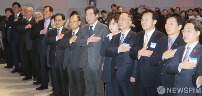 [서울=뉴스핌] 이형석 기자 = 이낙연 국무총리(오른쪽 여섯번째)가 4일 오후 서울 강남구 과학기술회관에서 열린 2019 과학기술인‧정보방송통신인 신년인사회에서 국민의례를 하고 있다. 2019.01.04 leehs@newspim.com