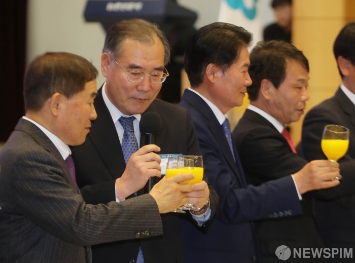 [서울=뉴스핌] 윤창빈 수습기자 = 이개호 농림축산식품부장관(왼쪽 두번째)이 8일 오후 서울 중구 농협중앙회에서 열린 ‘2019 농업인 신년인사회’에서 건배를 하고 있다. 2019.01.08 pangbin@newspim.com