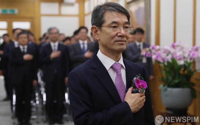 [서울=뉴스핌] 윤창빈 수습기자 = 안철상 법원행정처장이 10일 오후 서울 서초구 대법원에서 열린 ‘제 24대 안철상 법원행정처장 이임식’에서 국민의례를 하고 있다. 2019.01.10 pangbin@newspim.com