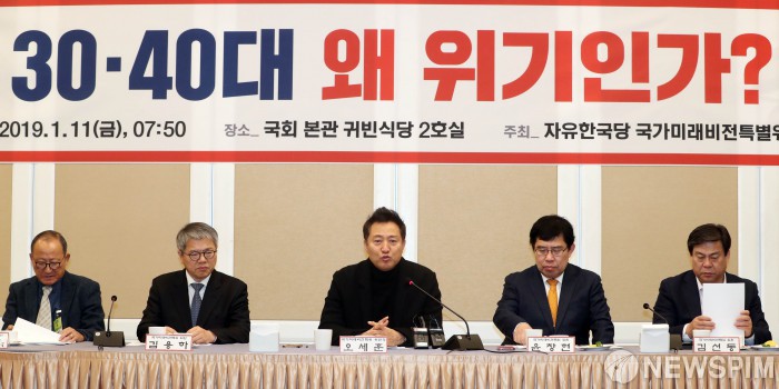 [서울=뉴스핌] 김학선 기자 = 11일 국회 귀빈식당에서 열린 자유한국당 국가미래비전특별위원회 사회경제분과 정책간담회 '30·40대 왜 위기인가?'에서 오세훈 위원장이 발언하고 있다. 2019.01.11 yooksa@newspim.com