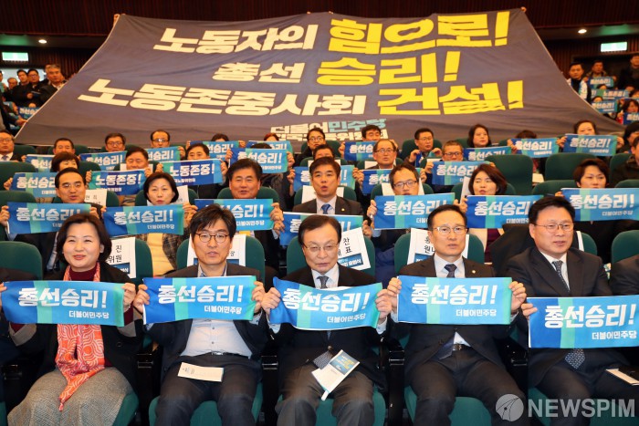 [서울=뉴스핌] 김학선 기자 = 이해찬 더불어민주당 대표와 홍영표 원내대표, 박해철 전국노동위원장 등 참석자들이 17일 국회도서관 대강당에서 열린 전국노동위원회 출범식에서 '총선승리'라고 쓰인 플래카드를 들고 퍼포먼스를 하고 있다. 2019.01.17 yooksa@newspim.com