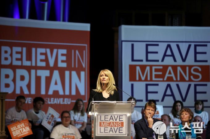 | [런던 로이터=뉴스핌] 정윤영 인턴기자 = 17일(현지시각) 영국 런던에서 브렉시트(영국의 유럽연합 탈퇴)찬성 집회 '탈퇴는 탈퇴(Leave Means Leave)'가 열린 가운데 에스터 맥베이 전 고용연금부 장관이 연설대에 올라 발언하고 있다. 2019.01.17. |