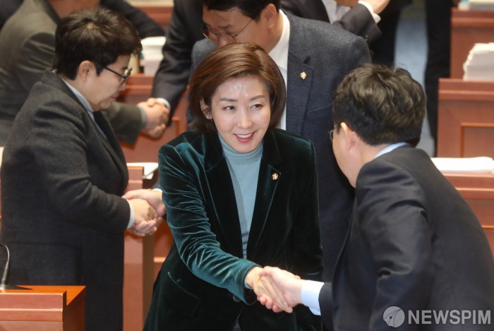 [서울=뉴스핌] 최상수 기자 = 나경원 자유한국당 원내대표가 28일 오후 서울 여의도 국회에서 열린 의원총회에서 김용태 사무총장과 악수를 나누고 있다. 2019.01.28 kilroy023@newspim.com