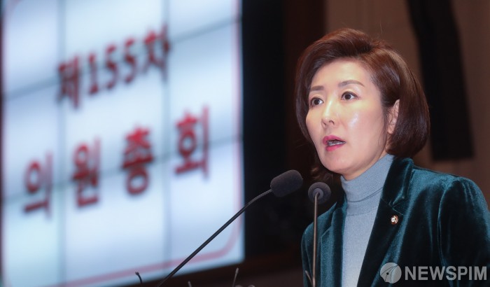 [서울=뉴스핌] 최상수 기자 = 나경원 자유한국당 원내대표가 28일 오후 서울 여의도 국회에서 열린 의원총회에서 발언하고 있다. 2019.01.28 kilroy023@newspim.com