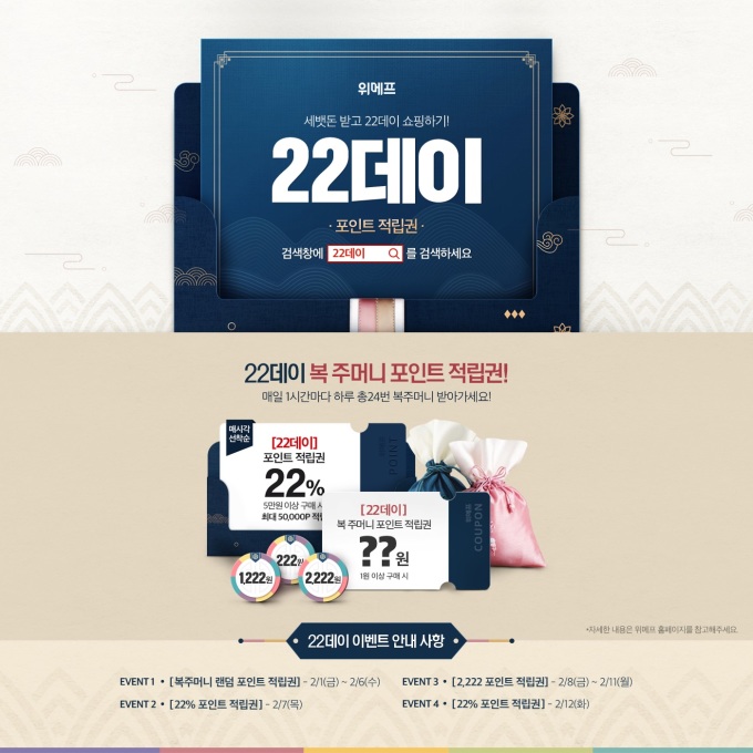 포인트를 받기 위해서는 적립권 발급 당일 [22데이], [슈퍼22데이] 말머리가 붙은 상품을 1원 이상 구매하면 된다. 1~6일까지 매일 참여한다면 최대 6회의 포인트가 최종 적립된다. 포인트는 2월 8일 일괄 지급되고, 적립일로부터 24시간 유효하다.