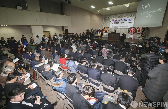 [서울=뉴스핌] 이형석 기자 = 8일 오전 서울 종로구 YMCA에서 동경 2.8 독립선언 제 100주년 기념식이 열리고 있다. 2019.02.08 leehs@newspim.com
