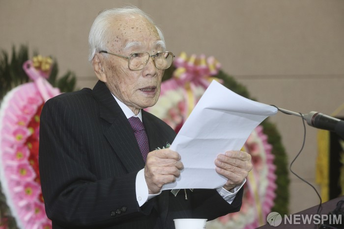 [서울=뉴스핌] 이형석 기자 = 조영진 한국독립유공자협회장이 8일 오전 서울 종로구 YMCA에서 열린 동경 2.8 독립선언 제 100주년 기념식에서 기념사를 하고 있다. 2019.02.08 leehs@newspim.com
