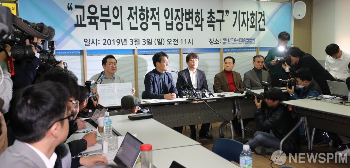 [서울=뉴스핌] 최상수 기자 = 이덕선 한유총 이사장이 3일 오전 서울 용산구 한국유치원총연합회에서 교육부의 전향적 입장변화를 촉구하는 기자회견을 열고 있다. 2019.03.03 kilroy023@newspim.com