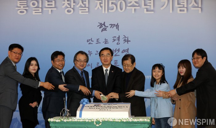 [서울=뉴스핌] 정일구 기자 = 조명균 통일부장관이 4일 오전 서울 종로구 정부서울청사 별관에서 열린 '통일부 창설 50주년 기념행사'에서 참석자들과 기념축하 케익을 커팅하고 있다. 2019.03.04 mironj19@newspim.com