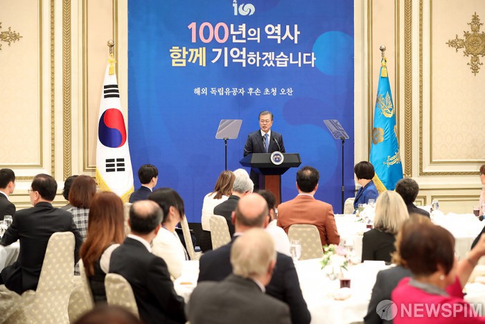 [서울=뉴스핌] 문재인 대통령이 4일 오전 3.1운동 100주년을 맞아 청와대 영빈관에서 열린 해외 독립유공자 후손 초청 오찬에 참석해 인사말을 하고 있다.문 대통령은 이날 특히 "정부는 국내외를 막론하고 독립유공자들의 뜻과 정신이 한반도의 완전한 평화, 함께 잘사는 나라로 열매 맺도록 노력할 것"이라며 "여러분 선조의 희생과 헌신은 영원히 빛날 것이다. 여러분을 존경하고 사랑하는 대한민국의 마음을 기억해달라"고 역설했다. [사진=청와대]. 2019.3.4