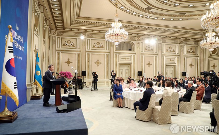 [서울=뉴스핌] 문재인 대통령이 4일 오전 3.1운동 100주년을 맞아 청와대 영빈관에서 열린 해외 독립유공자 후손 초청 오찬에 참석해 인사말을 하고 있다.문 대통령은 이날 특히 "정부는 국내외를 막론하고 독립유공자들의 뜻과 정신이 한반도의 완전한 평화, 함께 잘사는 나라로 열매 맺도록 노력할 것"이라며 "여러분 선조의 희생과 헌신은 영원히 빛날 것이다. 여러분을 존경하고 사랑하는 대한민국의 마음을 기억해달라"고 역설했다. [사진=청와대]. 2019.3.4