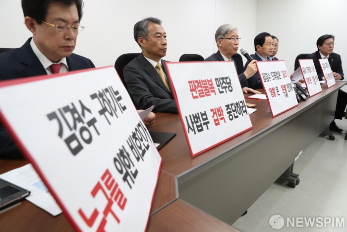 [서울=뉴스핌] 김학선 기자 = 5일 국회에서 열린 자유한국당 김경수·드루킹 게이트 진상규명 특별위원회 5차회의에서 여상규 위원장이 발언하고 있다. 2019.03.05 yooksa@newspim.com