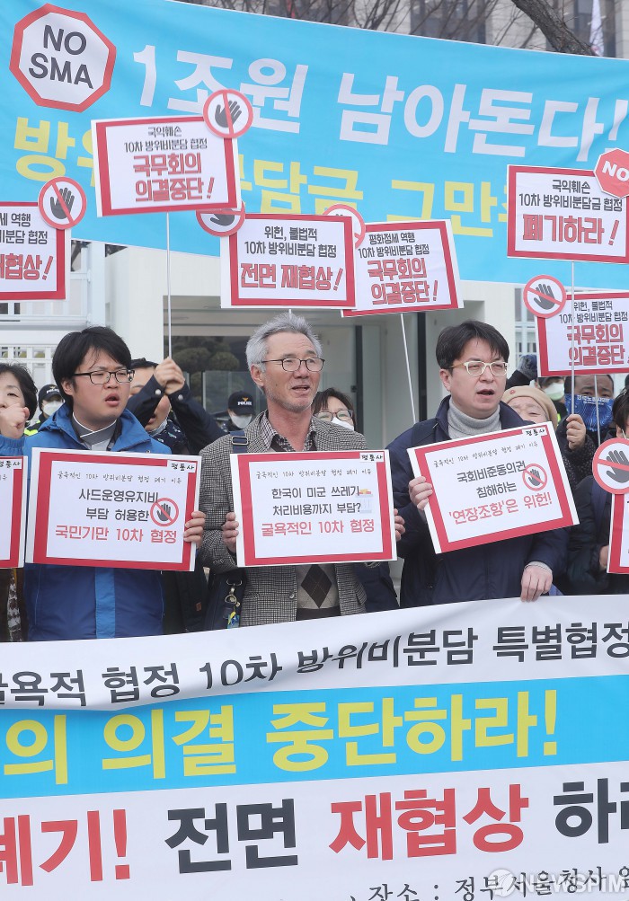 [서울=뉴스핌] 윤창빈 기자 = 5일 오전 서울 종로구 정부서울청사 앞에서 평화와통일을여는사람들 회원들이 방위비 분담 특별협정 국무회의 의결 중단을 촉구하는 기자회견을 진행하고 있다. 2019.03.05 pangbin@newspim.com
