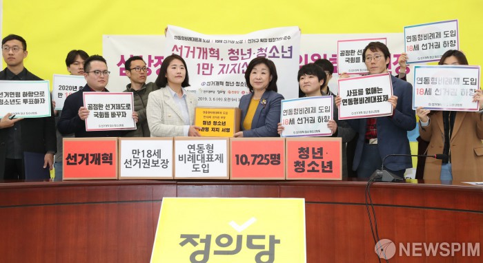[서울=뉴스핌] 김학선 기자 = 선거개혁 청년·청소년행동 관계자들이 6일 국회에서 심상정 국회 정치개혁특별위원회 위원장에게 연동형비례대표제 도입 및 만18세 선거권 보장 청년·청소년 1만명 지지 서명서를 전달하고 있다. 2019.03.06 yooksa@newspim.com
