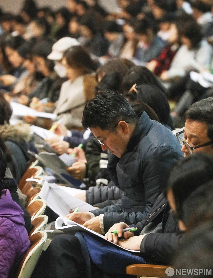 [서울=뉴스핌] 윤창빈 기자 = 9일 오후 서울 강남구 진선여자고등학교 회당기념관에서 열린 ‘종로학원 2020학년도 대입설명회‘에서 참석자들이 자료를 보면서 강연자의 말을 경청하고 있다. 2019.03.09 pangbin@newspim.com