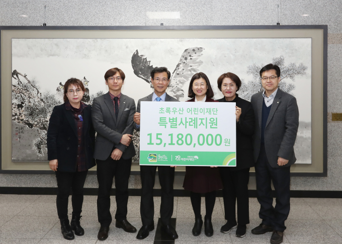 | 13일 초록우산 강원지역본부는 강릉시청을 방문해 2019년 특별사례지원금을 김한근 강릉시장(왼쪽 세번째)에게 전달했다.[사진=강릉시] |