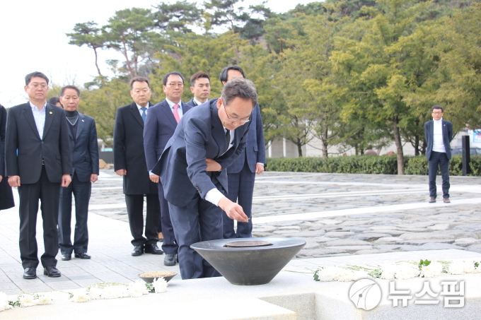| 더불어민주당 권민호 예비후보가 13일 이해찬 대표로부터 공천장을 수여받은 뒤 노무현 대통령 묘역을 찾아 참배를 하고 있다.[사진=권민호 예비후보] 2019.3.13. |