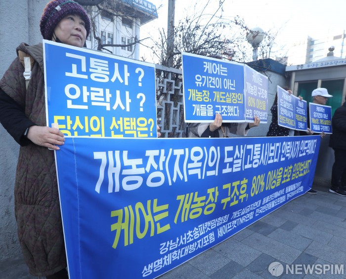[서울=뉴스핌] 윤창빈 기자 = 14일 서울 종로구 종로경찰서 앞에서 박소연 케어 대표를 지지하는 지지자들이 기자회견을 하고 있다. 2019.03.14 pangbin@newspim.com