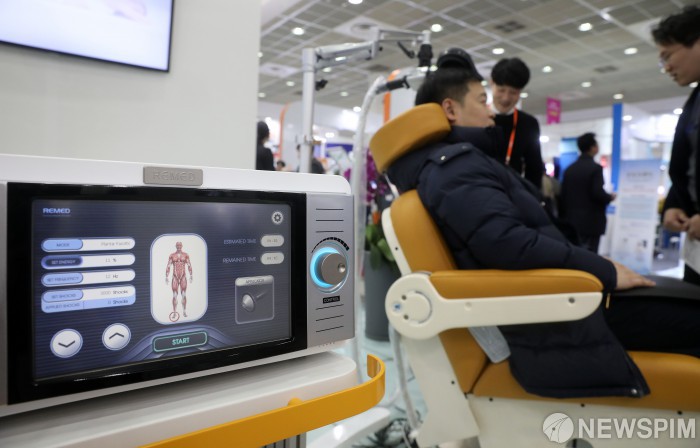 [서울=뉴스핌] 정일구 기자 = 14일 오후 서울 강남구 코엑스에서 열린 '제35회 국제의료기기·병원설치 전시회(KIMES 2019)'에서 관람객들이 의료기기 체험을 하고 있다. 2019.03.14 mironj19@newspim.com