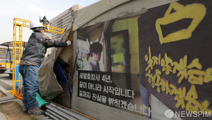[서울=뉴스핌] 최상수 기자 = 18일 오전 서울 종로구 광화문광장에서 세월호 참사 희생자 및 미수습자 분향소가 설치된 후 약 4년 8개월 만에 철거되고 있다. 2019.03.18 kilroy023@newspim.com
