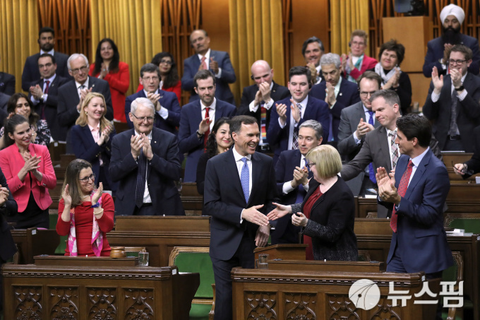 | [오타와 로이터=뉴스핌] 남혜경 인턴기자 = 빌 모르노 캐나다 재무장관이 팔러먼트힐에 있는 하원에서 연방정부 예산을 주제로 연설한 후 기립 박수를 받고 있다. 2019.03.19. |