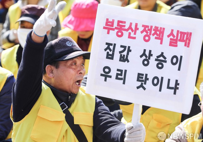 [서울=뉴스핌] 윤창빈 기자 = 29일 오후 서울 중구 서울시청 광장에서 은마아파트재건축조합추진위 주최로 열린 ‘은마아파트 재건축 심의통과 촉구 집회’에서 아파트 주민들이 피켓을 들고 구호를 외치고 있다. 2019.03.29 pangbin@newspim.com