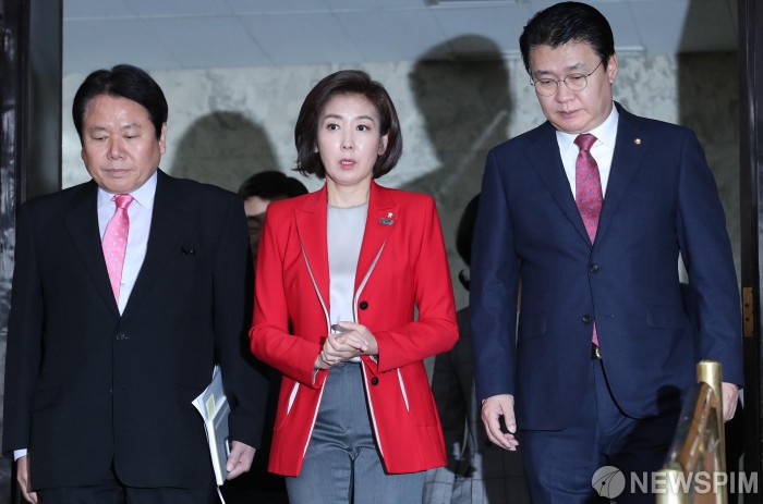 [서울=뉴스핌] 김학선 기자 = 나경원 자유한국당 원내대표가 2일 국회에서 열린 원내대책회의에 참석하며 지도부와 이야기를 나누고 있다. 2019.04.02 yooksa@newspim.com